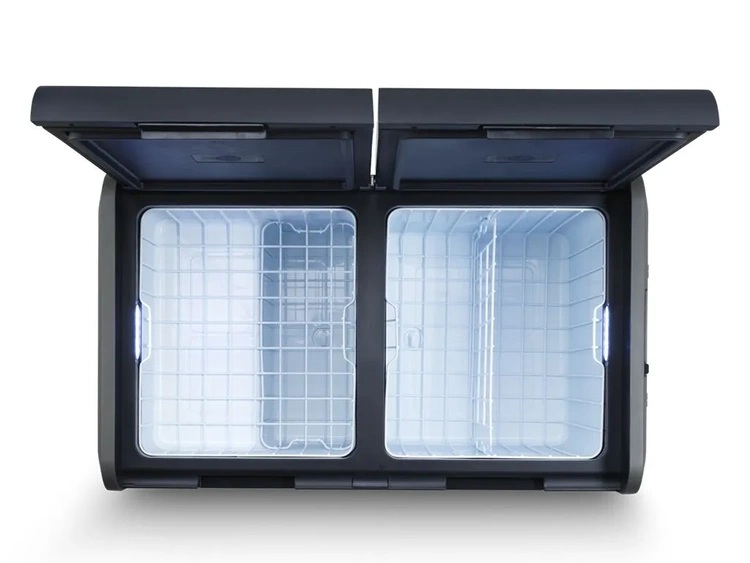 CFX5 95DZ Dometic to dwustrefowa mobilna chłodziarko-zamrażarka. Oznacza to, że urządzenie może jednocześnie chłodzić produkty w jednej komorze i zamrażać potrzebne produkty w drugiej komorze. Obie komory posiadają oddzielne pokrywy, dzięki czemu nie nagrzewamy całej lodówki szukając odpowiedniego produktu. Wyjmowane kosze w lodówce znacznie ułatwiają załadunek żywności. Wystarczy włożyć do nich wybrane produkty i zapełnione kosze włożyć do lodówki
